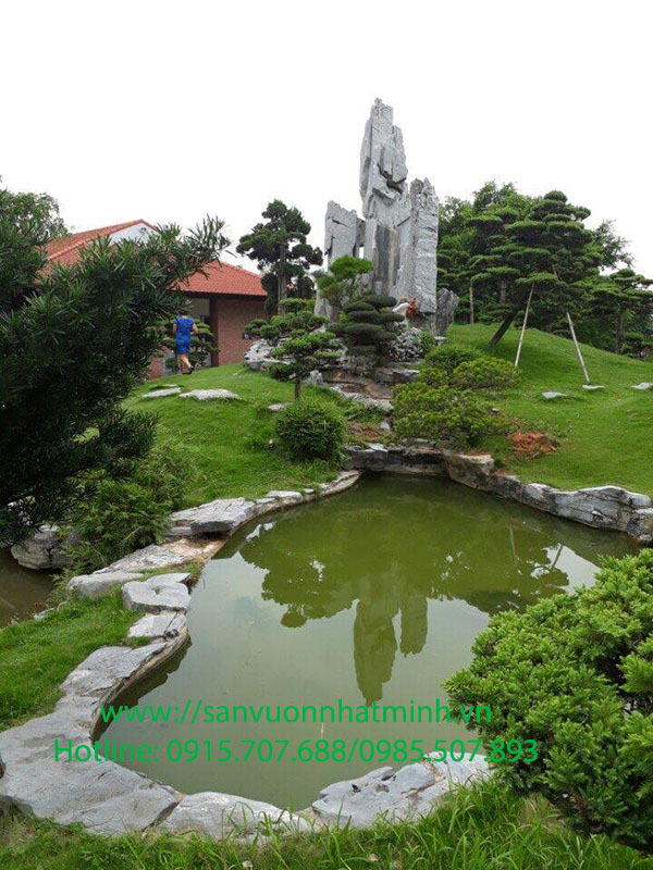 Hòn non bộ cao sừng sững, tạo dốc thoải về hồ cá nhỏ
